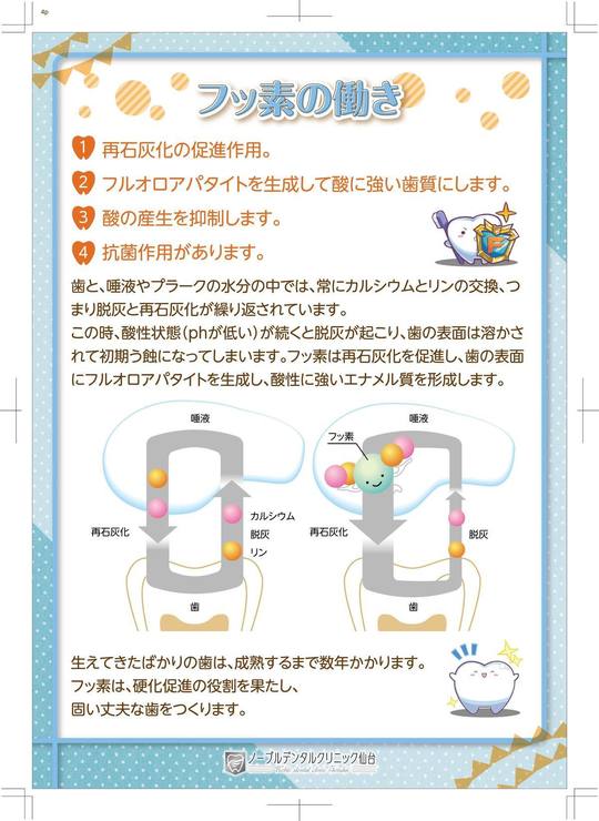 食事をすると酸によって歯に含まれるカルシウムやリンなどのミネラルが溶けだしますが、通常は唾液の働きによって溶けた成分が元の状態に戻ります。この働きを歯の再石灰化と呼びます。フッ素はこうした歯の再石灰化を助ける働きがあります。唾液中にフッ素イオンが存在していると、溶けだしたカルシウムがより多くエナメル質に再吸収されます。フッ素は再石灰化を促進して歯の修復を促します。この働きによって初期虫歯が治り、健康な歯を保つことができます。