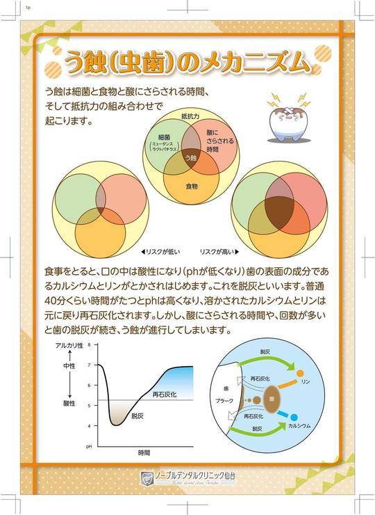 虫歯の原因には「細菌(ミュータンス菌)」「歯の質」「糖質」「時間の経過」の「4つの要素」があります。この4つの要素が重なると、虫歯が発生します。虫歯の予防に関して、この4つの要素について日頃から注意しておきたいことを説明します。