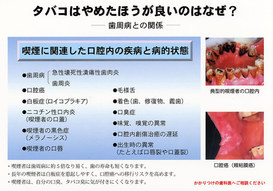 一般的にタバコを吸う人は、吸わない人に比べ3倍も歯周病にかかりやすく、また2倍も多く歯を喪失しているという報告があります。また喫煙本数と比例して歯周病が重症化することも分かっています。タバコが歯周病を悪化させる原因を説明します。