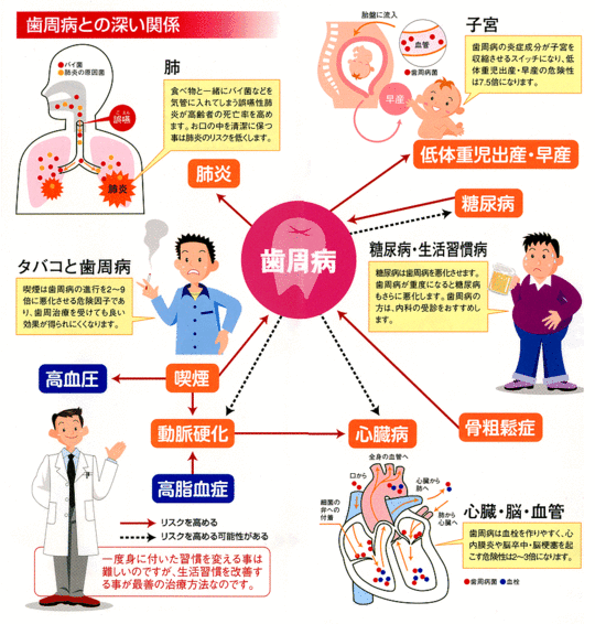 全身疾患と歯周病との関連性が近年の研究により指摘され始めています。歯周病との関連性が高いものには動脈硬化、呼吸器系疾患、心疾患、糖尿病、低体重児出産、早産などがあります。特に、糖尿病との関連性は高く、糖尿病は歯周病を悪化させる大きな原因と言われています。