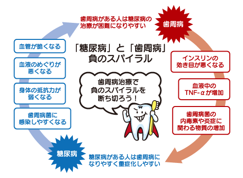 歯周病関連細菌から出される内毒素が、歯肉から血管内に入り込み、マクロファージからの腫瘍壊死因子(TNF-α)の産生を促進します。その結果、TNF-αの亢進が血糖値を下げる働きをもつホルモンであるインスリンを作りにくくします。すなわち、慢性炎症としての歯周炎の存在により、血糖値は上昇し、糖尿病のコントロールをますます困難にし、同時に歯周炎も進行していくという悪い循環に陥ります。