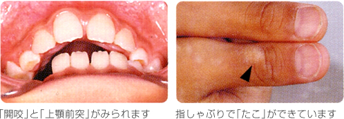 指しゃぶりによって上の前歯が持続的的に後ろから押されることで、上の前歯が前方に出てしまう状態になります。