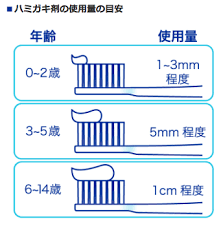 年齢に応じて適切な量の歯磨き粉を歯ブラシにつけます。0~2歳は1~3mm程度、3~5歳は5mm程度、6~14歳は1cm程度、大人は1~2cm程度が目安です。