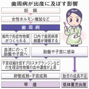 歯周病と早産・低体重児出産との関連性についてそのメカニズムはまだ完全に分かってはいません。歯周病菌によって口腔内で炎症性物質が多く放出され、それによって陣痛が早くなり、結果的に早産や低体重児出産が増えるのではないかという考え方が有力です。また、胎盤や子宮などの出産に関わる器官が歯周病原細菌に感染することも、早産・低体重児出産に影響するのではないかと考えられています。