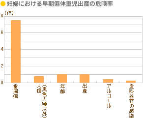 歯周病と早産・低体重児出産との関連性は、1996年に米国Offenbacherらが妊婦あるいは出産後3日以内の産婦に歯周病の検査を行い、歯周病の妊産婦は早産あるいは低体重児出産に対するリスクが7.5倍も高かったと報告しています。