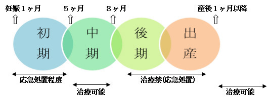 治療の態勢が苦しく、早産のリスクもあるため治療に適した時期ではありません。この時期の治療はなるべく避けて、応急処置にとどめておいた方がいいです。