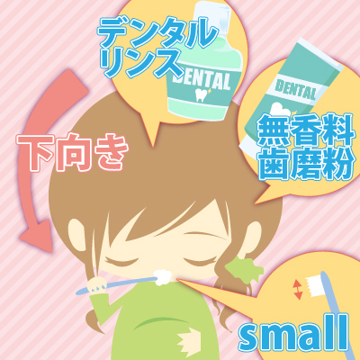 一日の中で体調の良い時間や空腹満腹時を避けた時間にリラックスして歯磨きを行うようにします。その時にヘッドの小さい歯ブラシを使うようにします。歯ブラシは大きい物を使用すると、のどにぶつかり嘔吐反射が起きやすくなります。歯磨きの時は、下の方を向いて前かがみの体勢になり、歯ブラシを舌に当てないようにすると嘔吐感を避けやすいです。歯ブラシは小刻みに優しく動かします。また歯磨き粉は、香料や味の強いものは避けるようにします。デンタルリンスの使用も効果的です。
