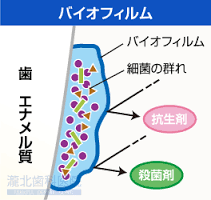 歯の表面には歯を守るためにバイオフィルムという薄い膜があります。バイオフィルムは最近の塊で、虫歯や歯周病が起こります。バイオフィルムは洗口剤や歯みがきだけでは取れず、機械的にこすったり、振動を与えて剥がす必要があります。そのためPMTCで機械的な振動を与え、定期的にバイオフィルムを除去していく必要があります。