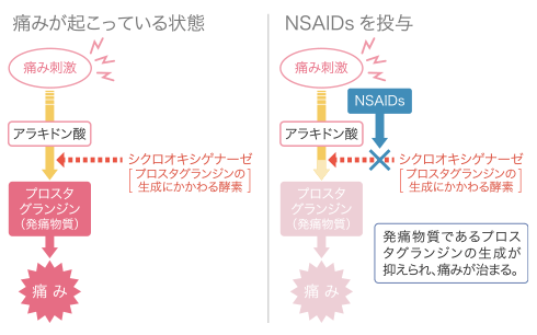 体の中で発熱や痛みがある時は、体内にもともと存在するプロスタグランジン(PG)という物質が患部で活動し、炎症や発熱を引き起こします。ロキソニンの成分であるロキソプロフェンはシクロオキシゲナーゼの働きを阻害してプロスタグランジン(PG)が発生しにくくなる(生まれにくくなる)ように働きます。その結果、発熱や痛みといった炎症が体内で起こりにくくなります。