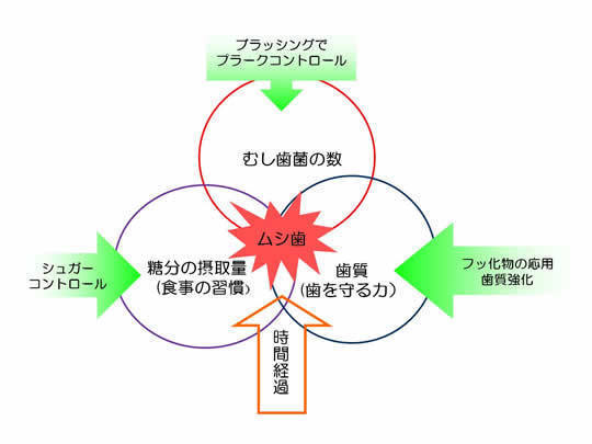 それにプラスして、「時間経過」により次第に虫歯が進行します。 虫歯の予防は、3つの要因の重なっている時間をいかに短くするかが重要です。この虫歯のメカニズムを意識的にコントロールすることが予防なのです。
