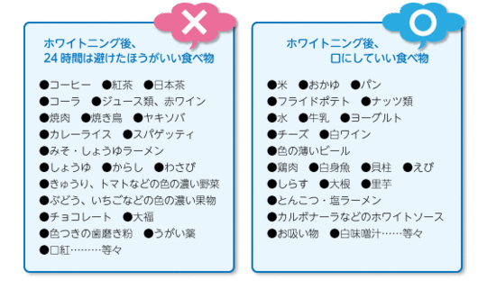 ホワイトニングの効果を最大限に発揮させるには、着色しやすい食べ物や飲み物は避けるようにしたほうがよいです。着色のおそれが高いものを下記に示しますので、なるべく控えましょう。