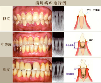 歯周病は最初は歯肉の腫れや出血だけですが、進行と共に歯の周りの骨も吸収されます。