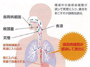 誤嚥性肺炎の原因となる細菌はその多くが歯周病菌であると言われており、誤嚥性肺炎の予防には歯周病のコントロールが重要になります。