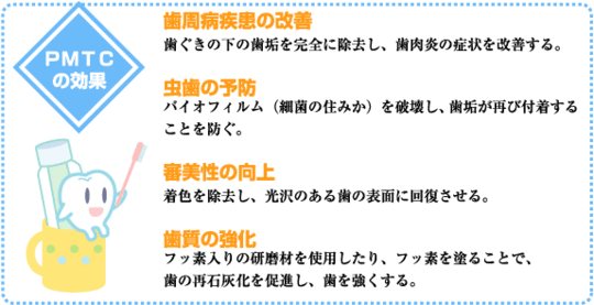 PMTCでは普段の歯磨きでは取れない汚れを除去することが可能です。また、細菌の塊のバイオフィルムまで除去することができるので歯周病の症状改善や虫歯予防ができます。