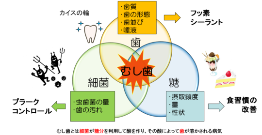 虫歯の原因には「細菌」「糖」「歯の質」の3つの要素があります。3つの要素が重なった時、時間の経過とともに虫歯が発生します。