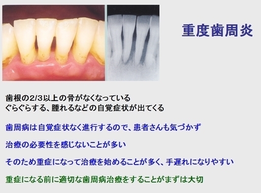 歯周病が進行したまま放置されていると、急に発症した全身疾患の処置を行う場合に大きな障害となり、場合によっては全身疾患の治療の延期や中断も必要になります。