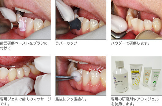 ラバーカップやチップなど専用の器具を使って歯の表面を磨いて着色を除去します。また、着色が強固な場合にはエアフローというジェットエアーで超微粒子の粉末を歯に吹きかけて着色を除去する器具を使用する場合もあります。当院では、少しずつ時間をかけて、なるべく痛みがないように治療を行います。