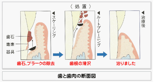 歯周病が進むと歯ぐきは炎症を起こして腫れ、歯と歯ぐきの境目の歯周ポケットが深くなります。痛みや出血をそのままにしておくと、歯周病はさらに進行し、歯の土台である歯槽骨が溶け、歯がグラグラの状態になり、痛みがさらに強くなり咬むことすら出来なくなります。スケーリングで歯周ポケット付近を清掃すると痛みや出血がありますが、通常の場合は麻酔をするほどではありません。また、健康な歯ぐきを傷つけて血が出ることとは違うので、スケーリングでの出血はさほど心配する必要はありません。 どうしても痛みが我慢できない場合は、左手を上げて歯科医師や歯科衛生士に意思表示すると、適切な強さに調節してくれたり、麻酔をしたりといった対応を行ってくれます。