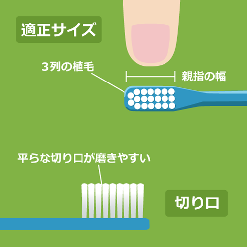 一般的に適正な大きさとされているのは、縦の植毛が3列になっており、横の長さが「親指の幅」もしくは「人差し指の先から第一関節までの長さ」と同じくらいのものです。ヘッドが大きすぎると、奥歯や歯の隙間などの細かい所に毛先が当たりにくく、磨き残しが生じやすくなります。