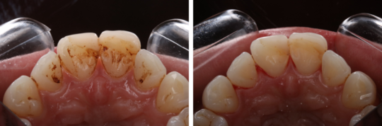 当院ではエアフローと呼ばれる小さな粉を歯に吹き付けます。1回の施術で効率よく汚れを除去でき、歯の表面に付着した粒子が表面を磨き上げるのでツルツルになります。また、見た目も良くなり清潔感がアップします。この粉を吹き付けるというやり方が 痛みがなく、爽快感があります。