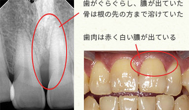 根尖性歯周炎とは、虫歯菌が歯髄(歯の中の神経や血管)に波及して、炎症を起こしている病気のことです。歯の神経が死んでしまうと神経が腐って細菌が増殖します。硬い歯に周囲を囲まれているため自然に治ること出来ないため、根の先から細菌や毒素を骨の中に放出します。この細菌や毒素によって骨が溶かされ、根の先に膿の塊が生じた状態を根尖病巣と言います。そのまま放置するとあごの骨にまで拡大して、あごの骨の中にまで病巣が広がります。治療は、最初は歯の根の治療である根管治療を行います。根の治療を行っても治らない場合には、外科的に根尖病巣を取り出す歯根端切除術を行います。また、抜歯することもあります。