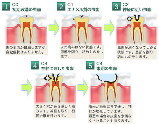 C3と同様に冠をかぶせるか、やむを得ない場合は抜歯を行います。抜歯の場合は、「ブリッジ」や「入れ歯」、または「インプラント」を行う必要があります。激しい痛みがしばらく続いた後も虫歯を放置すると、やがて痛みがなくなる時がきます。C4まで虫歯が進行すると痛みを感じる神経そのもの壊死してしまうので、痛みを感じなくなります。この状態をさらに放置すると、根に膿を持つようになり、強烈な痛みを感じるようになります。 |