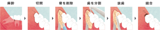 ⑤ 歯冠の引っかかっている部分を削り分割します。(斜めにはえている場合、手前の歯に引っかかっているため、普通の歯と違い、 そのままの状態では抜けません。抜歯する時に、手前の歯にあたらないような状態にします。)