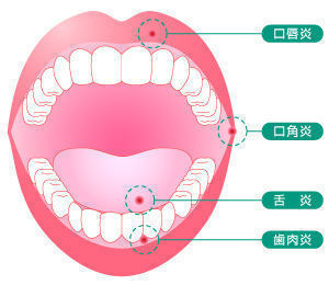 口内炎とは、頬の内側や歯ぐきなど、口の中や周辺の粘膜に起こる炎症の総称です。呼吸や食事をすることにより、口の中には、ほこりや細菌、ウイルスなどが侵入しやすくなります。これらの侵入を防いでいるのが口腔内の粘膜です。口腔内の粘膜がこれらをからめとり、咳などで体外に排出しています。しかし、侵入した細菌などによって炎症を起こすことがあります。その中でも特定の場所に生じる場合は、歯ぐきなら「歯肉炎」、舌なら「舌炎」、唇なら「口唇炎」、口角なら「口角炎」と呼ばれます。患部は潰瘍になったり水疱になったりします。
