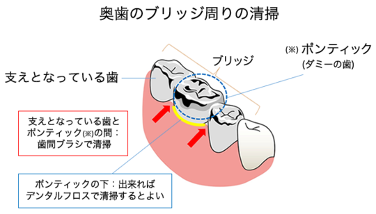 ブリッジ治療を行った場合、その装着部分を掃除するのに歯間ブラシが役立ちます。ブリッジは失った歯の両隣を使って“橋渡し”を行う治療法です。つなげた歯の部分は、デンタルフロスを上から通すことが出来ないなので、歯間ブラシを使って清掃します。この場合、サイズはMかLサイズの比較的大きめのものを使用するのが適切です。