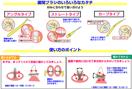 大きすぎると歯肉を傷つけてしまい、小さすぎると清掃効率が悪くなります。針金が引っかからずに通る範囲で、なるべく太いものを選ぶと良いです。奥歯についてはまっすぐなストレートタイプよりも柄が曲がったアングルタイプが使いやすいです。
