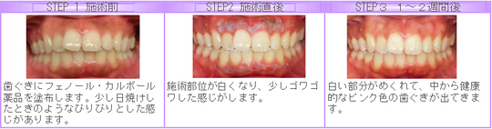 ⑤ | 塗布直後から2~3日で歯ぐきが白くなり、1週間ほどで白い部分が剥がれてきれいな歯ぐきに置き換わります。 大切な用事がある場合は、直前ではなく1~2週間くらい前の施術をおすすめします。 |