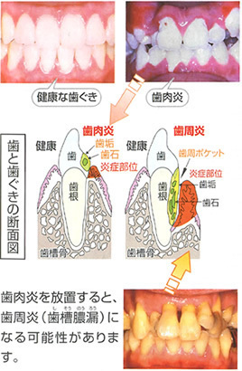 歯肉にのみ炎症が限局しているのが歯肉炎、炎症が歯周組織(歯肉・セメント質・歯根膜・歯槽骨)にまで広がっているのが歯周炎です。歯肉炎は治療により健全な状態に戻りますが、歯周炎は骨の吸収により歯肉が下がり、健全な状態には戻りません。