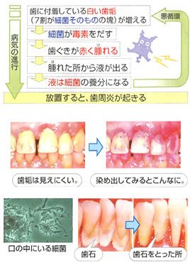 プラークは乳白色で歯の色に近いため目で見ても気づきにくいですが、上図のように染め出し液で染色すると磨き残しがある場合は赤く染まります。また、上図の写真は歯肉炎の方のプラークを生きたまま位相差顕微鏡で観察した写真です。細長い細菌がびっしりと集まっています。細菌の大きさは直径が数ミクロンです。プラークが主要な炎症の原因で除去することで歯肉炎は改善し、歯石の除去によりプラークが付着しにくい環境になります。