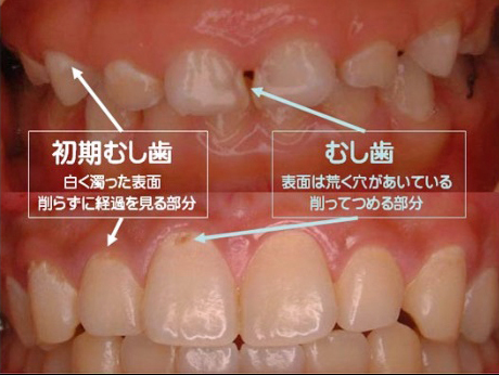 歯の表面にある白い斑点は、白いチョーク状になって見えます。歯の表面のエナメル質が酸性などに傾いた状態が続いた結果、歯の表面のエナメル質にあるカルシウムが少なくなって脱灰して白濁している状態です。これは虫歯の初期の段階と考えられています。歯の表面が白くなっているだけなので、虫歯の穴はまだ見られません。しかしこの状態が長期的に続くと、虫歯の穴が生じてしまいます。