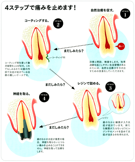 知覚過敏は一過性の痛みですが、痛みの持続時間が長い場合や痛みが非常に激しい場合には、歯の神経に炎症が起きている可能性があります。なるべく歯の神経は残すべきですが、生活に支障がある場合は歯の神経を取り除く治療をすることもあります。