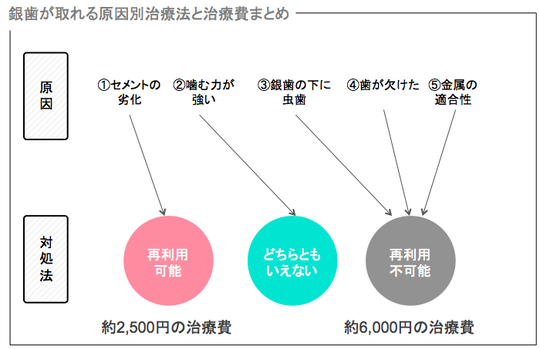 取れた銀歯を再利用できる場合です。銀歯を保存して歯医者で再装着した場合の料金は、2,500円程度です。治療回数も1回のみで終わります。
