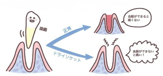 ドライソケットとは、ドライ(乾いた)ソケット(窩=穴)という意味で、抜歯をした後の穴に血の塊ができずに、穴があいて骨が露出している状態のことを言います。「抜歯窩治癒不全」とも呼ばれています。