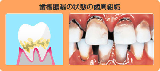 歯槽膿漏は歯の周りの骨が溶かされる病気です。骨が溶けるとその上の歯ぐきも下がり、歯が長くなったように見えます。