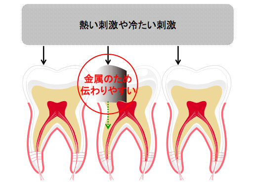 銀歯は金属のために冷たいものや熱いものの熱の伝わりがよく、銀歯の治療後にしみることがあります。1週間程度で徐々に落ち着いてくる場合が多いです。その間は冷たいものや熱いものが銀歯の部分に当たらないようにして下さい。