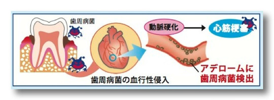 心筋梗塞は動脈硬化が原因であると言われています。歯周病はこの動脈硬化を進行させることが判明してきました。口の中に住んでいた歯周病菌は、口の中の毛細血管から血管内に入り込みます。その歯周病菌の刺激により動脈硬化を誘導する物質がでてきます。血管内にアテローム性プラークと呼ばれる粥状の脂肪性沈着物が出来ることで血液の通り道が狭くなり、冠動脈を硬化させると言われています。この事はヒトの大動脈のアテローム性動脈硬化症と呼ばれる患者さんの病変の中から5~20%ぐらいの割合で歯周病菌の遺伝子が見つかっていることからも確認されています。全ての心筋梗塞の原因が歯周病にあるわけではありませんが、歯周病があると動脈硬化を進行させる原因になってしまいますので、放置せずにしっかりと治療を行いましょう。