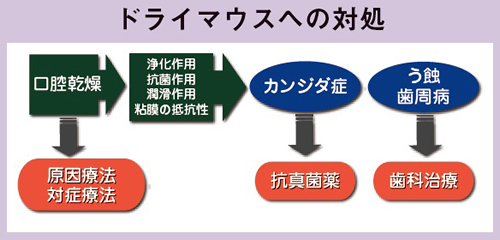 唾液腺の病気やシューグレン症候群が原因の場合があります。糖尿病や腎臓病の患者さんでは、ひとつの症状としてドライマウスになることがあります。