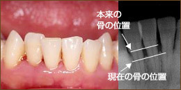 歯槽骨は顎の骨の中にあり、歯の根が埋まっている部分です。歯槽骨の槽とは、歯を入れておくオケの事を意味しています。歯周病の特徴が歯槽骨の吸収です。歯槽骨は歯ぐきに覆われていて、見た目では吸収しているかどうか分かりません。歯槽骨の吸収が大きくなると、歯ぐきが腫れたり、膿が出たりします。最終的には歯が揺れて抜けてしまいます。 歯周病で歯槽骨が減っていく原因は歯周病菌の出す毒素が歯槽骨を破壊するためと言われています。