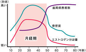 骨粗鬆症と歯周病は一見無関係のように思われがちです。しかし、実はそうではありません。エストロゲンの分泌量が低下すると全身の骨密度に大きく影響することが知られていますが、同じように歯を支える歯槽骨にも危険因子となることが最近分かってきました。