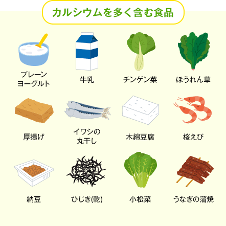 また、カルシウムの吸収を助けるビタミンDやビタミンKを含む食品も一緒にとりましょう。ビタミンDはきくらげ、しらす干し、さけ、いわしなど、ビタミンKは納豆、わかめ、春菊、小松菜、ほうれん草などに多く含まれています。