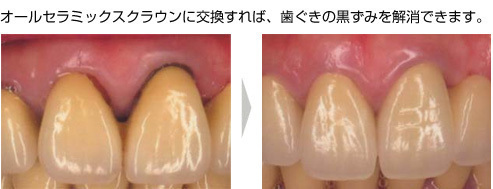 金属を使う保険の差し歯やメタルボンド(金属の表面にセラミックを焼き付けたもの)の場合、金属が歯ぐきに漏れ出し、歯ぐきが黒くなってしまうことがあります。特に金属の土台を使うと歯ぐきが黒くなりやすいです。一度黒くなってしまった歯ぐきは刺青のようになり、被せ物を後から変えても、歯ぐきの色は戻りません。そのため前歯には金属を使わない治療をお勧めします。