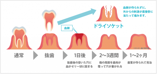 抜歯した部分が血餅(固まり始めた血液)でふさがれずに骨の部分が露出してしまい、激しく痛むことをドライソケットといいます。 通常は抜歯後2~3日でなくなる痛みが治まらず、1週間以上も痛みが続きます。触れると痛いなどの症状が出ます。これは何らかの原因で抜歯した穴が血液で覆われず、かさぶたが出来なかったためです。骨の上に歯肉が作られず骨が露出したままの状態です。物が入ると直接触れるために強い痛みを生じます。 ドライソケットは抜歯窩治癒不全とも呼ばれ、抜歯後の発生率は2~4%で、下顎の親知らずでは約20%とも言われています。