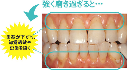 歯を強く磨き過ぎると歯ぐきが後退し、歯ぐきの中の歯根が出てくる場合があります。 歯根は硬く覆われている歯とは違い、柔らかいセメント質で出来ているため、すり減りやすくなっています。このような状態になると、歯ブラシで歯を磨いた時、冷水を飲んだ時や冷たい食品を食べた時に、歯がしみるような痛みが出ます。いわゆる知覚過敏です。