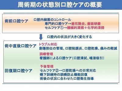 周術期口腔ケアは術前・術中直後・回復期の3つの過程に分かれています。各段階で口腔ケアの目的は大きく異なり、それぞれのケアの内容に合った口腔ケア用品を使用することが大切です。その内容と必要性について説明します。