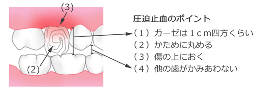 まずは、清潔なガーゼを丸めてしっかり咬んで圧迫止血をしましょう。ガーゼは、抜歯した所よりも少し大きめにするのが効果的です。小さすぎると十分に咬んで圧迫させることが出来ません。大きめに丸めて作る事がお勧めです。この時には必ず清潔なガーゼを使用して下さい。ガーゼがない場合は、ティッシュでも問題ありません。柔らかく作るのではなく硬く丸めることがポイントです。また、止血の確認の為に、何度も外して見たりすることは絶対にしないで下さい。ガーゼは、30分程度しっかりと強く咬んで下さい。
