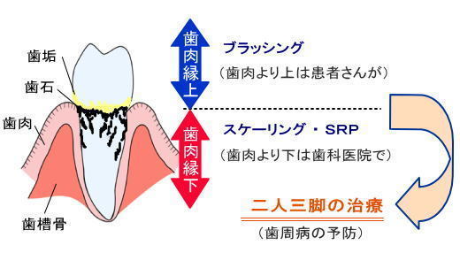 歯周病は初期の段階であれば、自宅でのセルフケアである程度は改善できます。しかし、それだけでは不十分で、歯医者さんでの清掃(スケーリングやSRP)で歯石や歯ぐきの深い部分の汚れを取り除く必要があります。